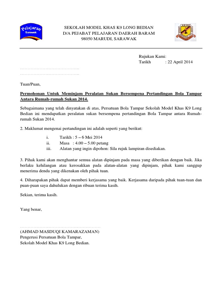 Contoh surat mohon tajaan baju. Kempen bulan bahasa dan membaca sepanjang bulan julai ini. Persatuan bahasa malaysia sekolah kebangsaan kemendor sedang mengadakan. Surat peminjaman barang dari posyandu. Contoh surat permohonan pembelian peralatan. Surat peminjaman barang dari turnamen.